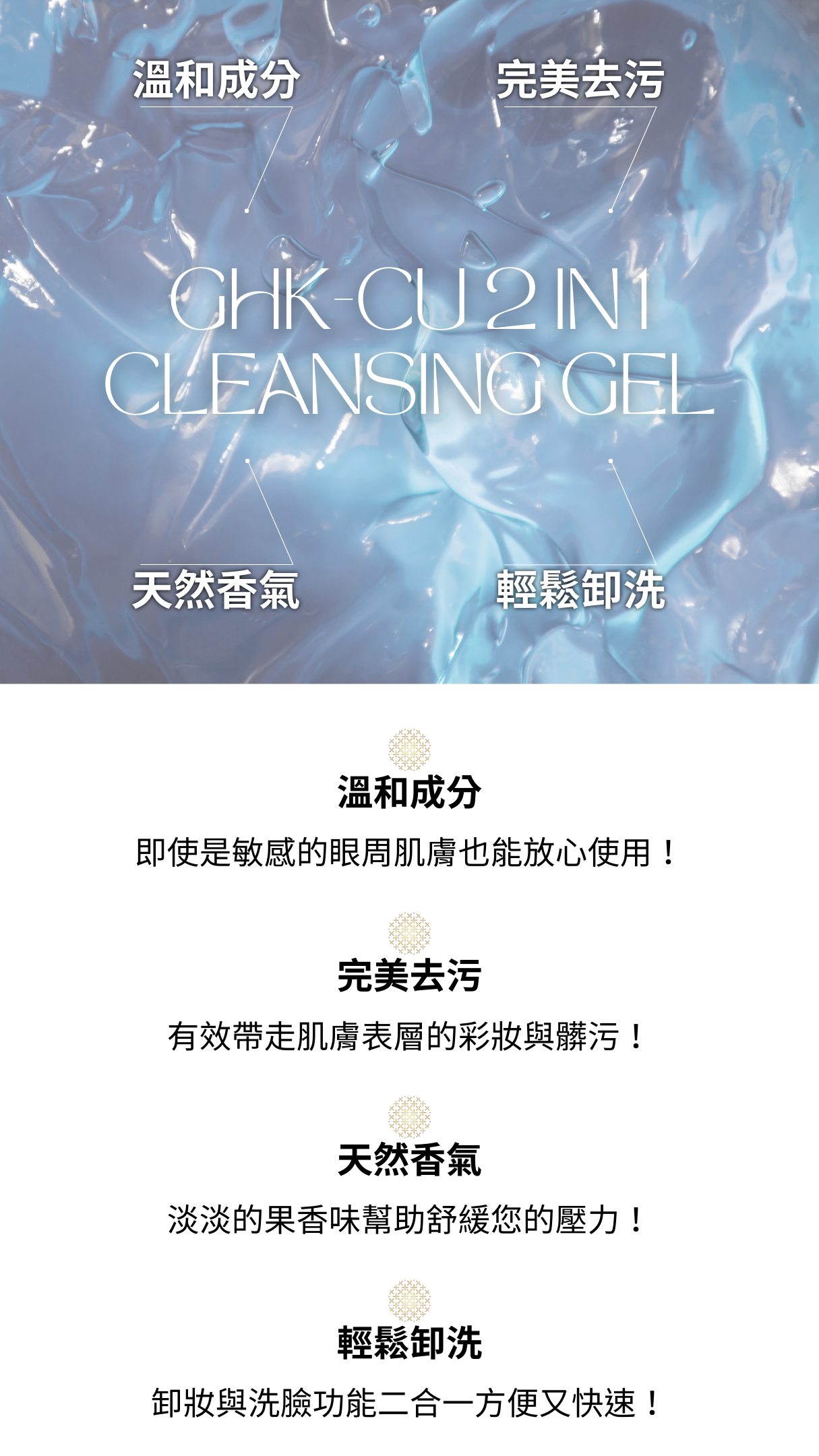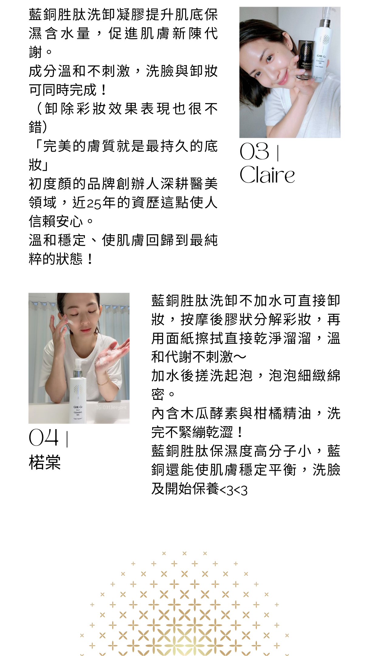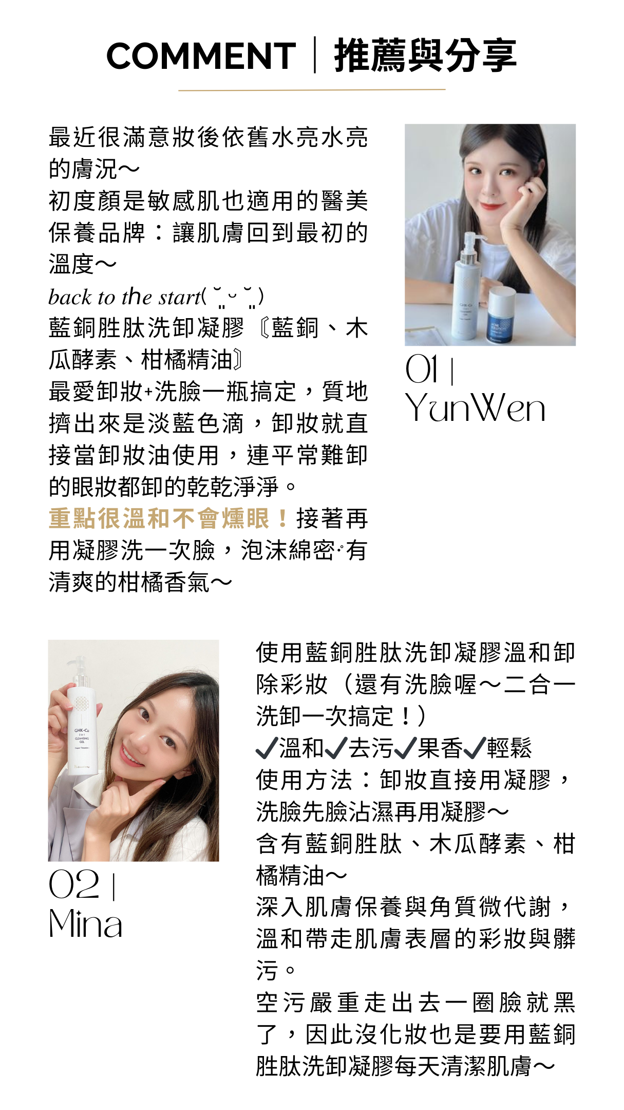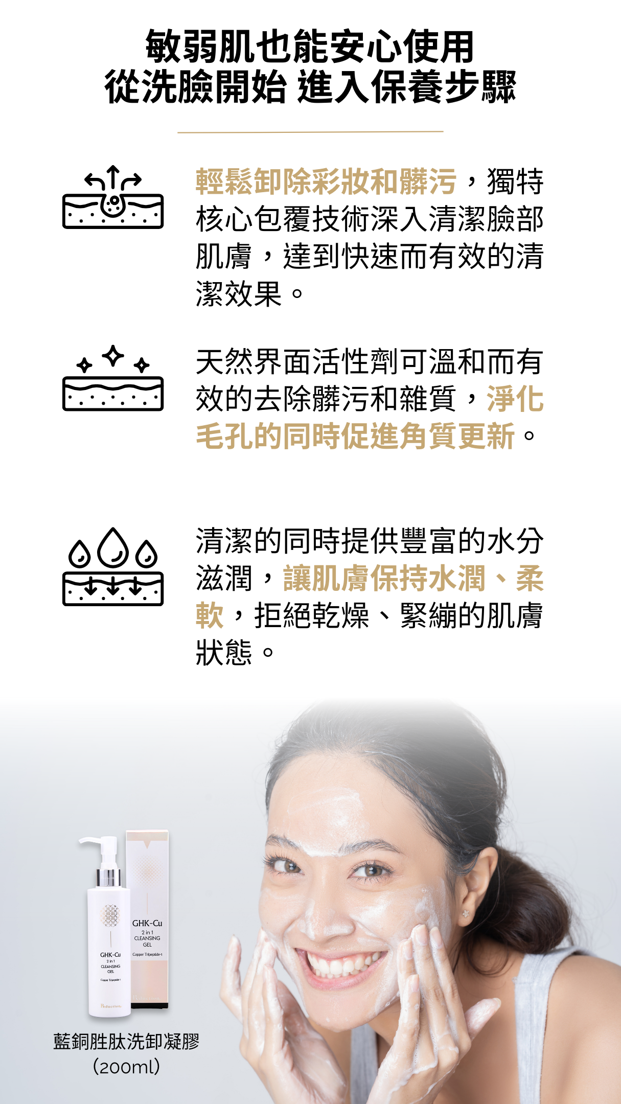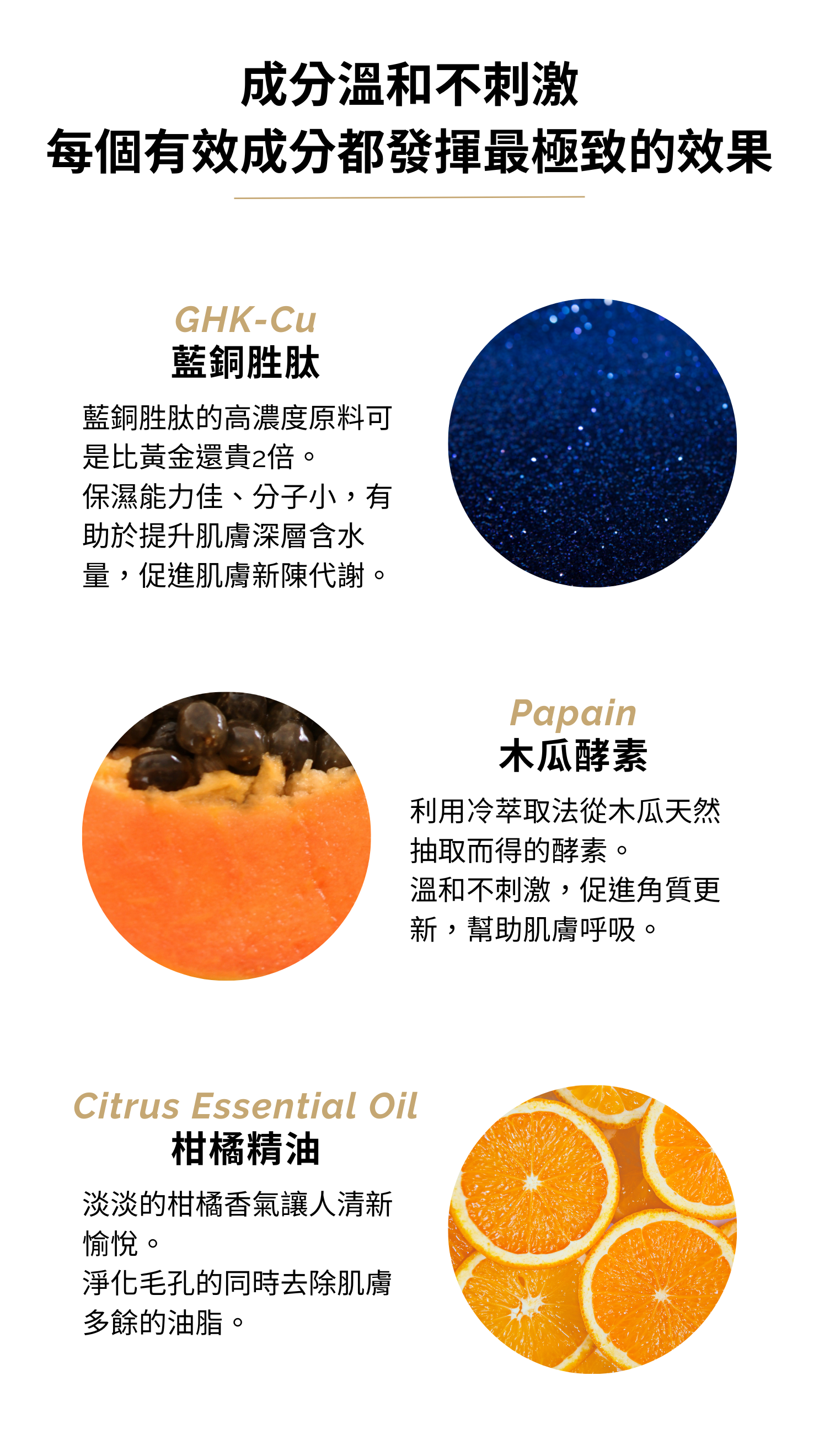 藍銅胜肽、微晶酵素透過雙核心包覆技術結合,有效深入肌膚,達到瞬時保養與角質微代謝,專屬的Lipo-Eraser,同時具親水及親脂端的清潔效果,能溫和有效帶走肌膚表層的彩妝與髒污,天然果香味更能維持完整無負擔清潔的好心情。