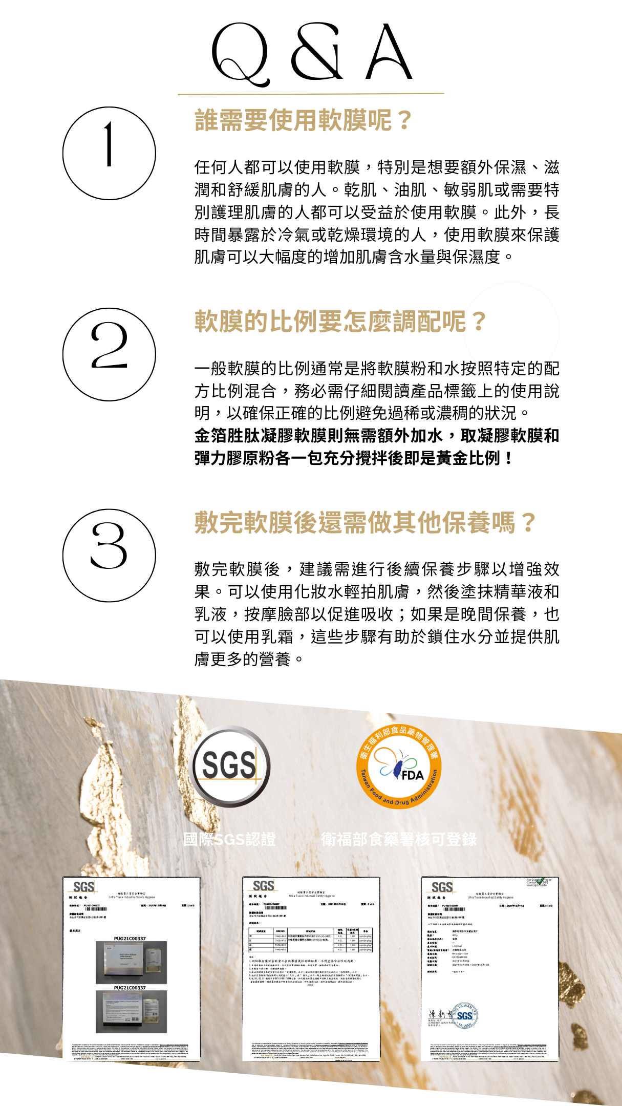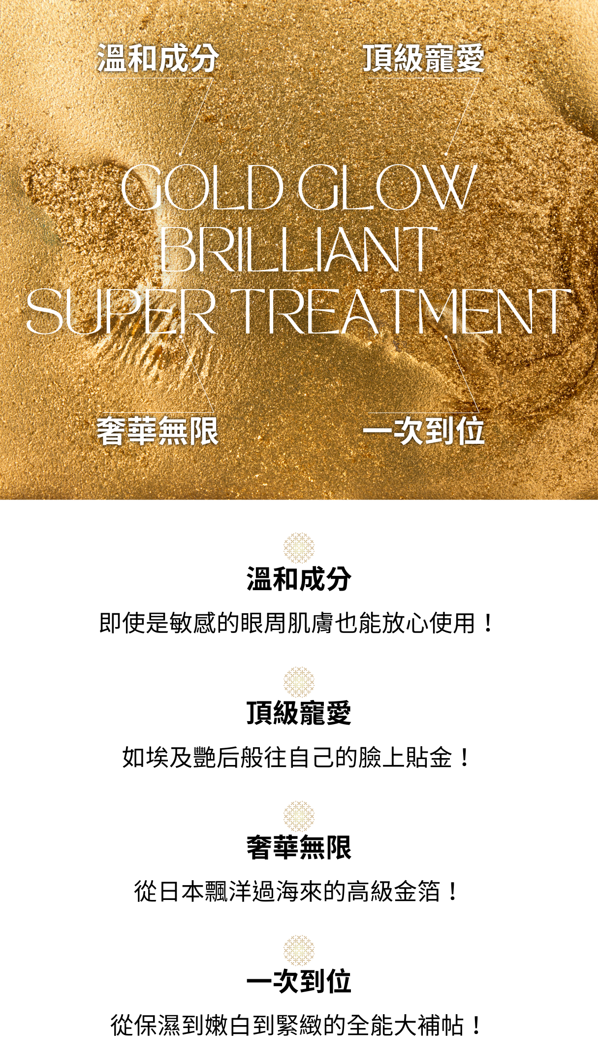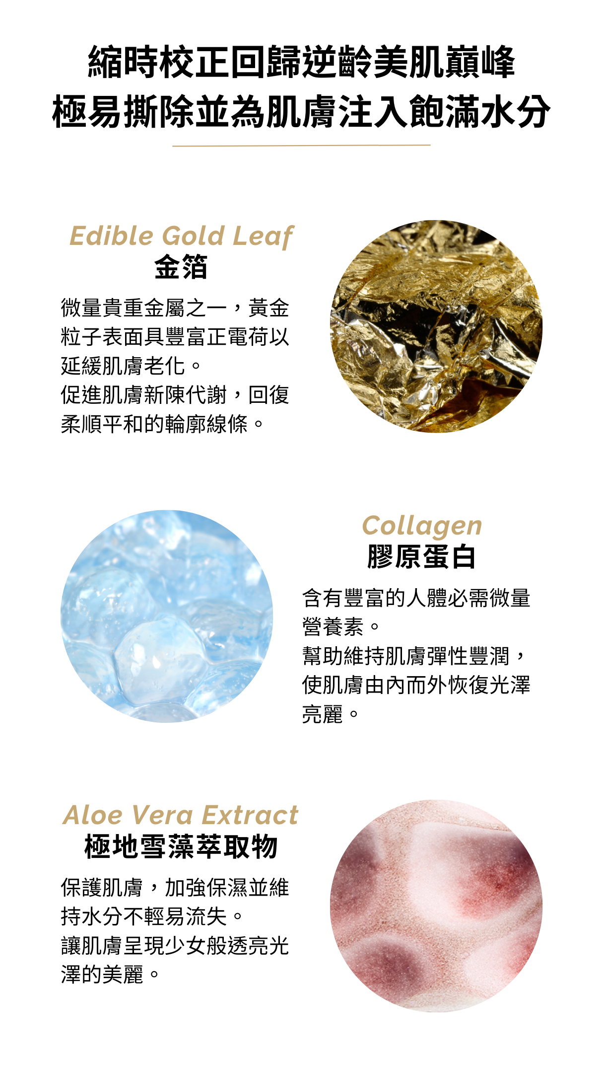 多種活力成份,膠原蛋白、玻尿酸、極地雪藻、六胜肽、神經醯胺等,為肌膚注入滿滿活力,日本頂級金箔更能增加肌膚光澤逆齡感。