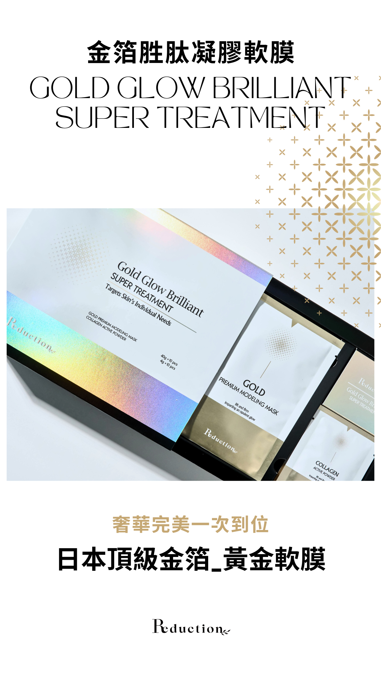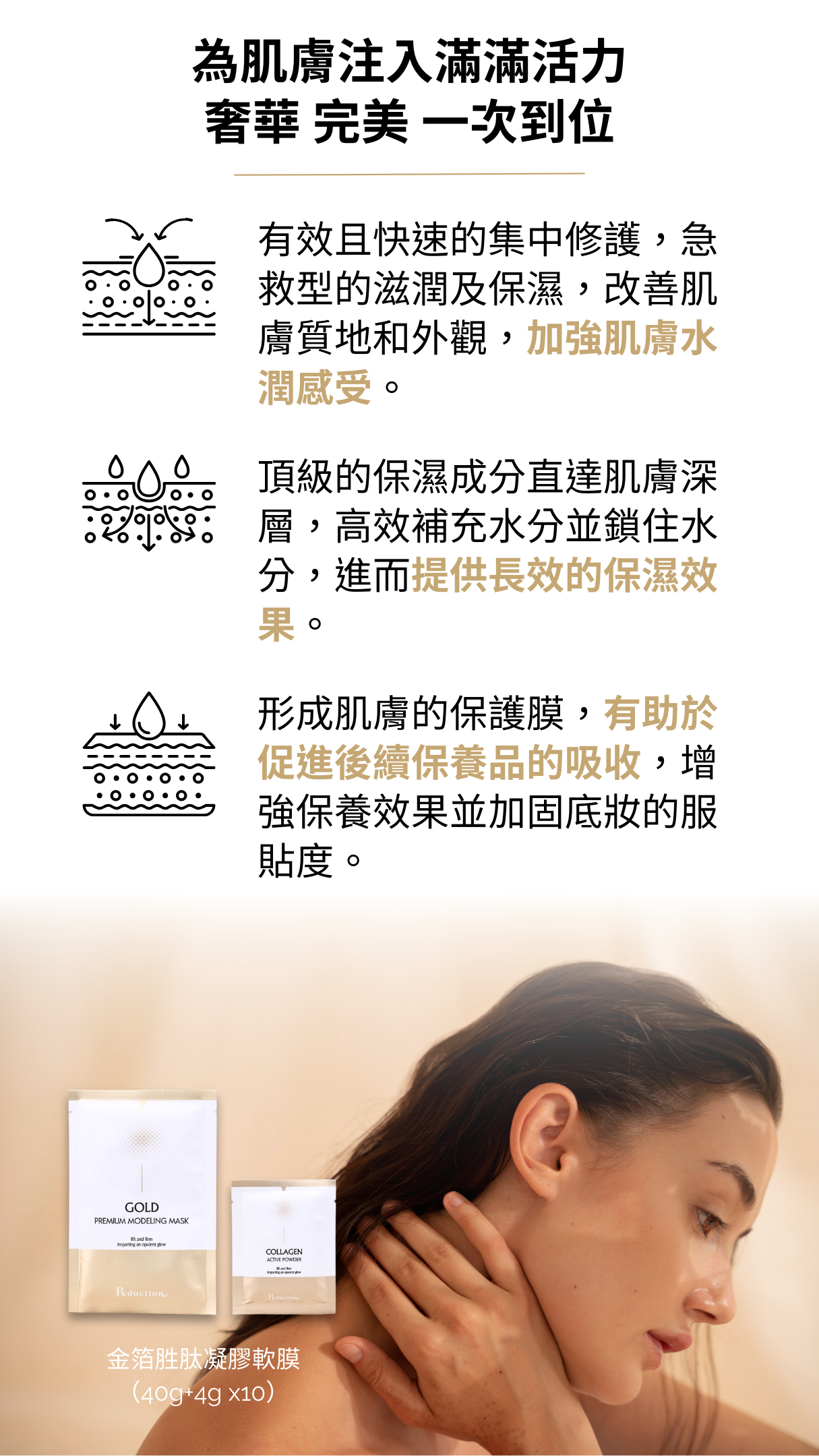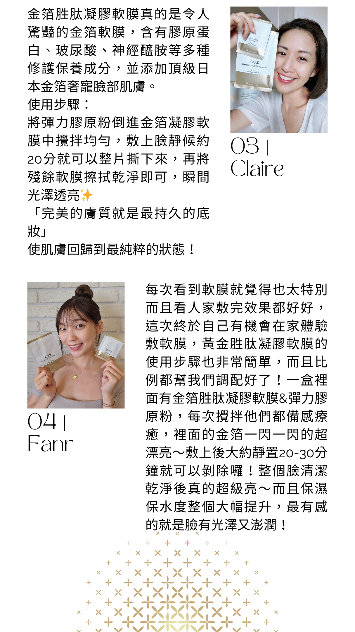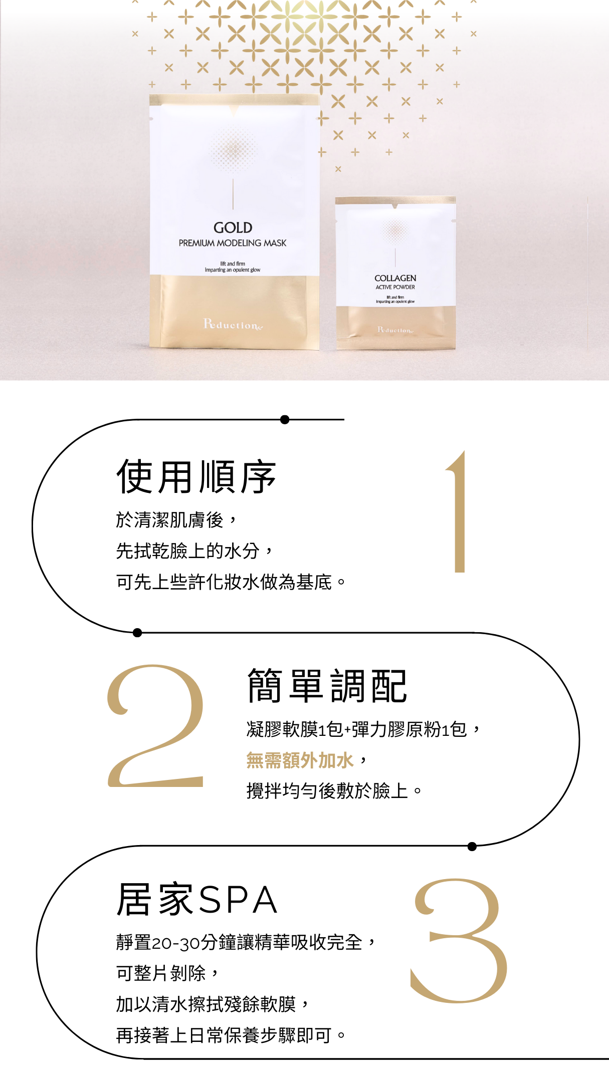 多種活力成份,膠原蛋白、玻尿酸、極地雪藻、六胜肽、神經醯胺等,為肌膚注入滿滿活力,日本頂級金箔更能增加肌膚光澤逆齡感。