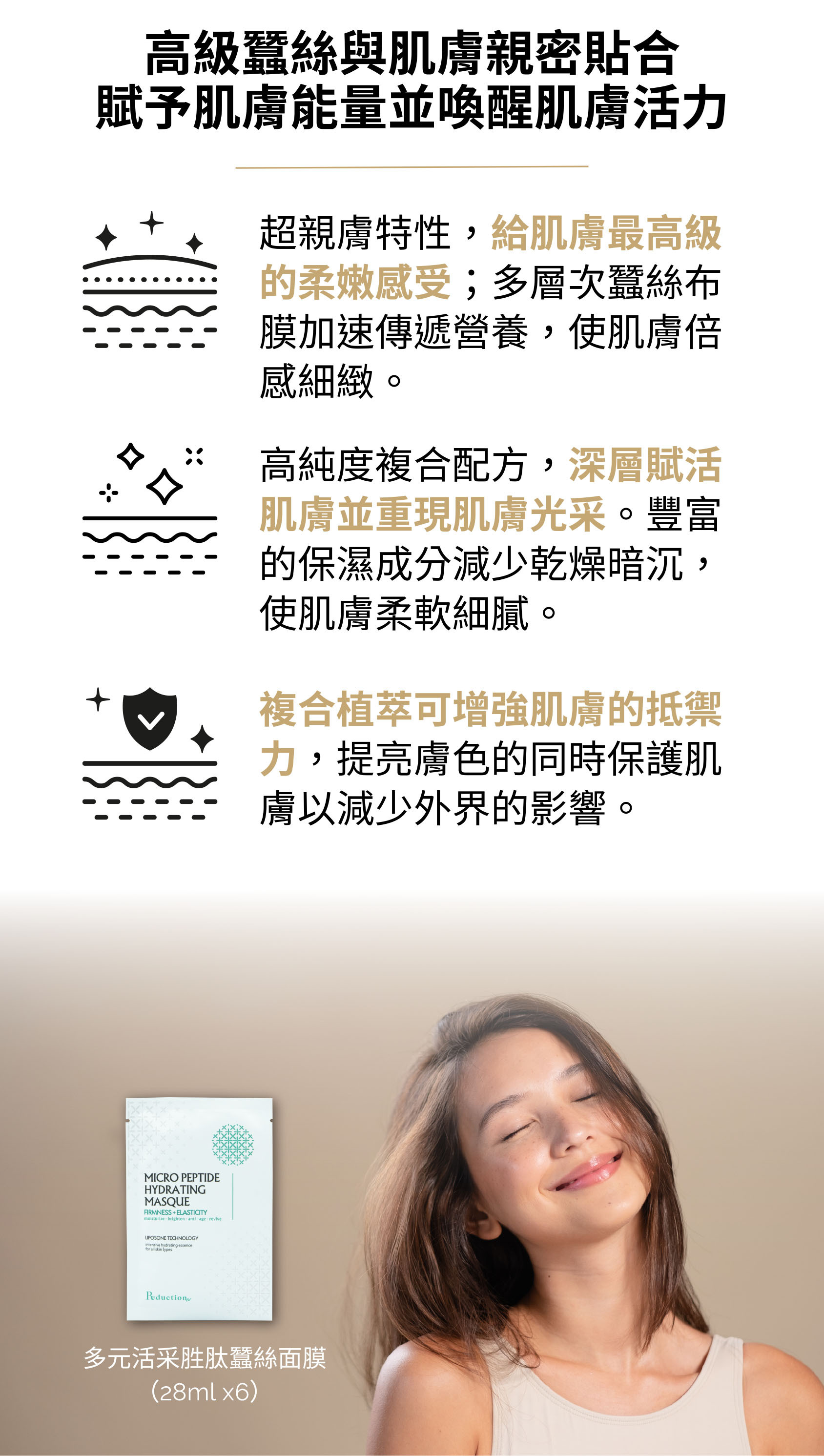 嚴選日本頂級蠶絲特長纖維,密集導入豐沛精華;