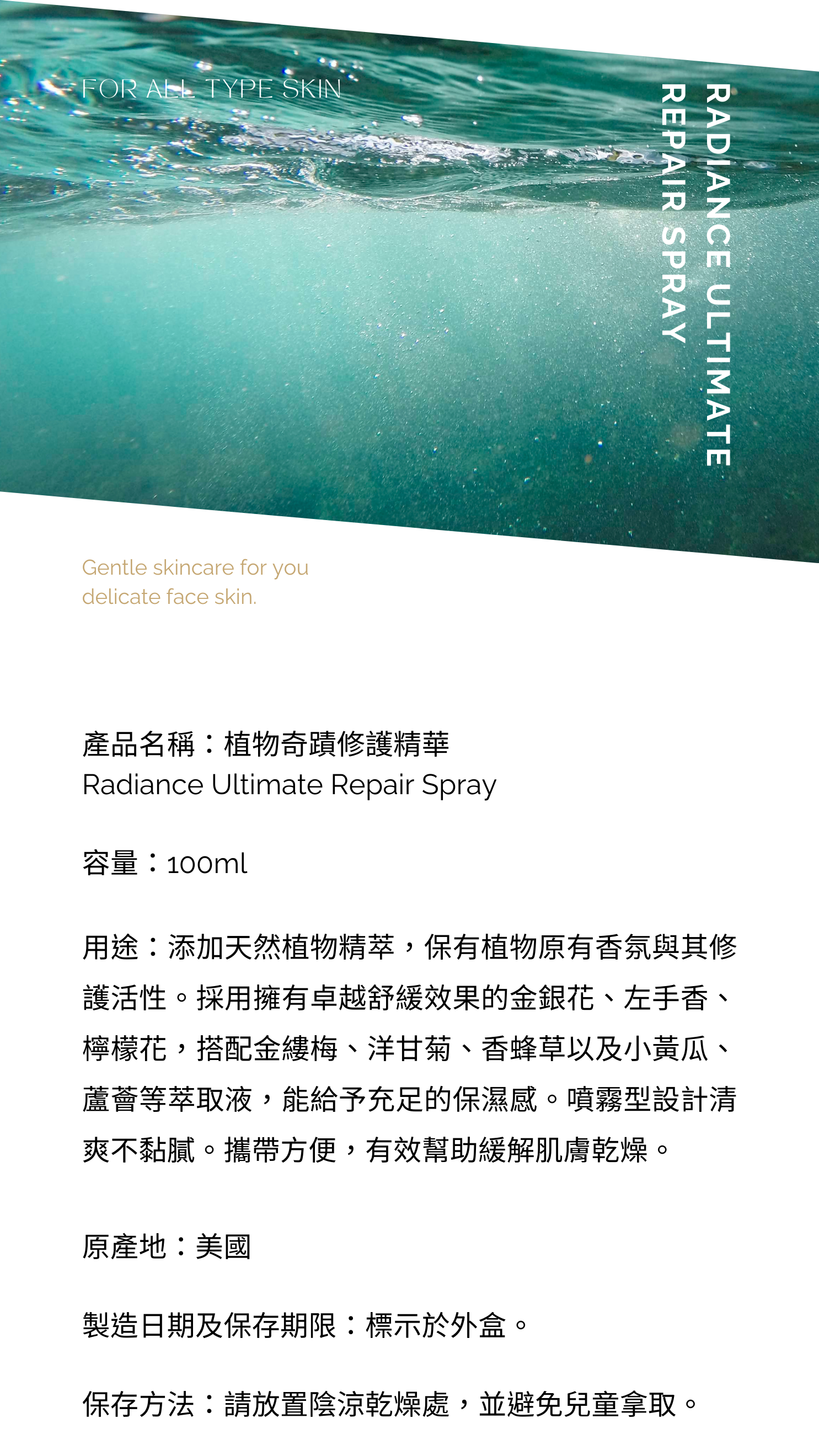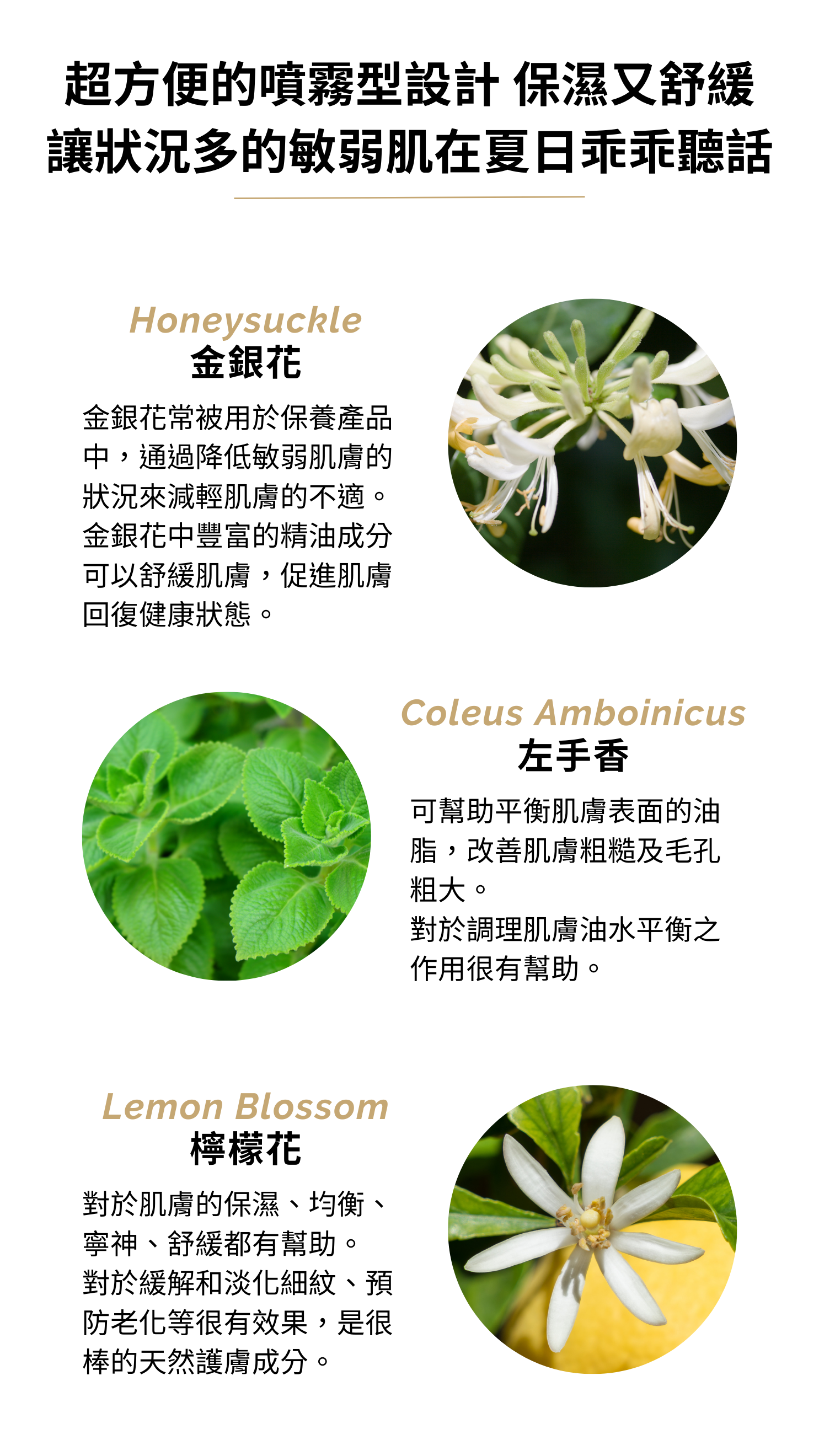 採用擁有卓越舒緩效果的金銀花、左手香、檸檬花,搭配金縷梅、洋甘菊、香蜂草以及小黃瓜、蘆薈等萃取液,能給予充足的保濕感。