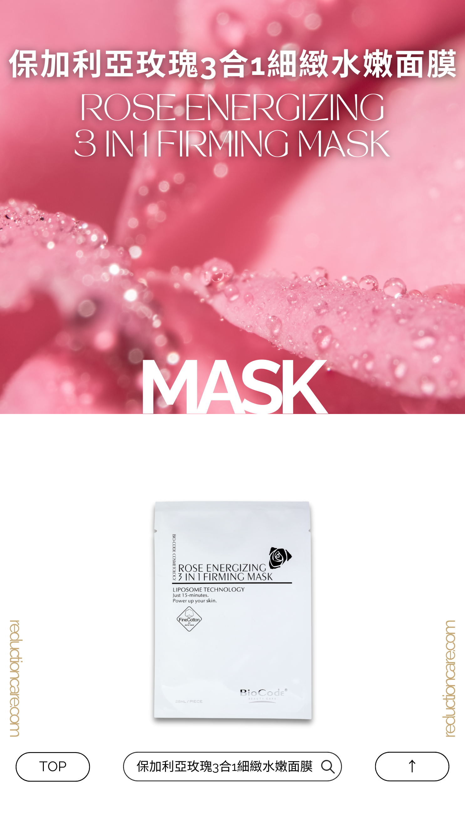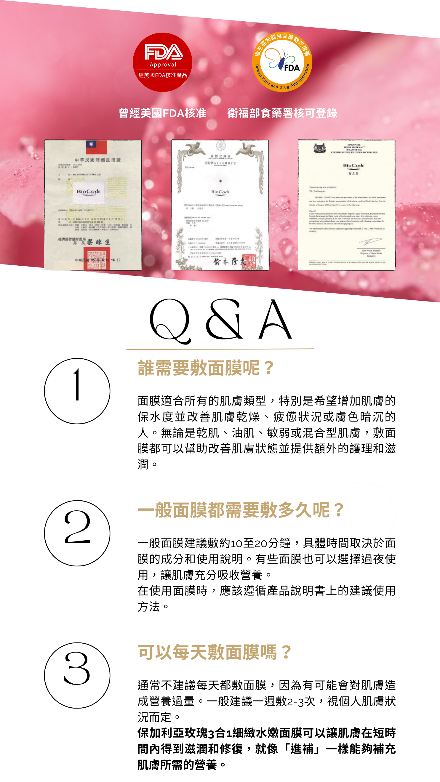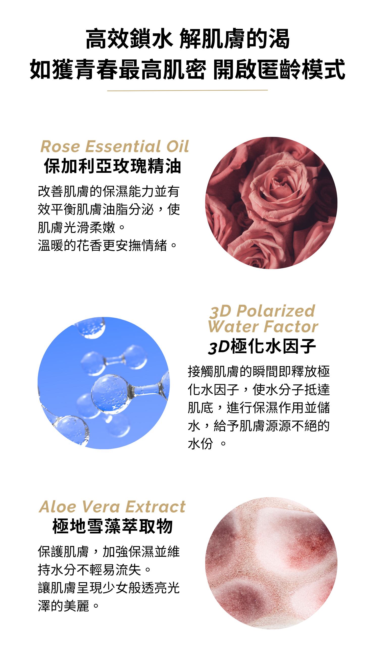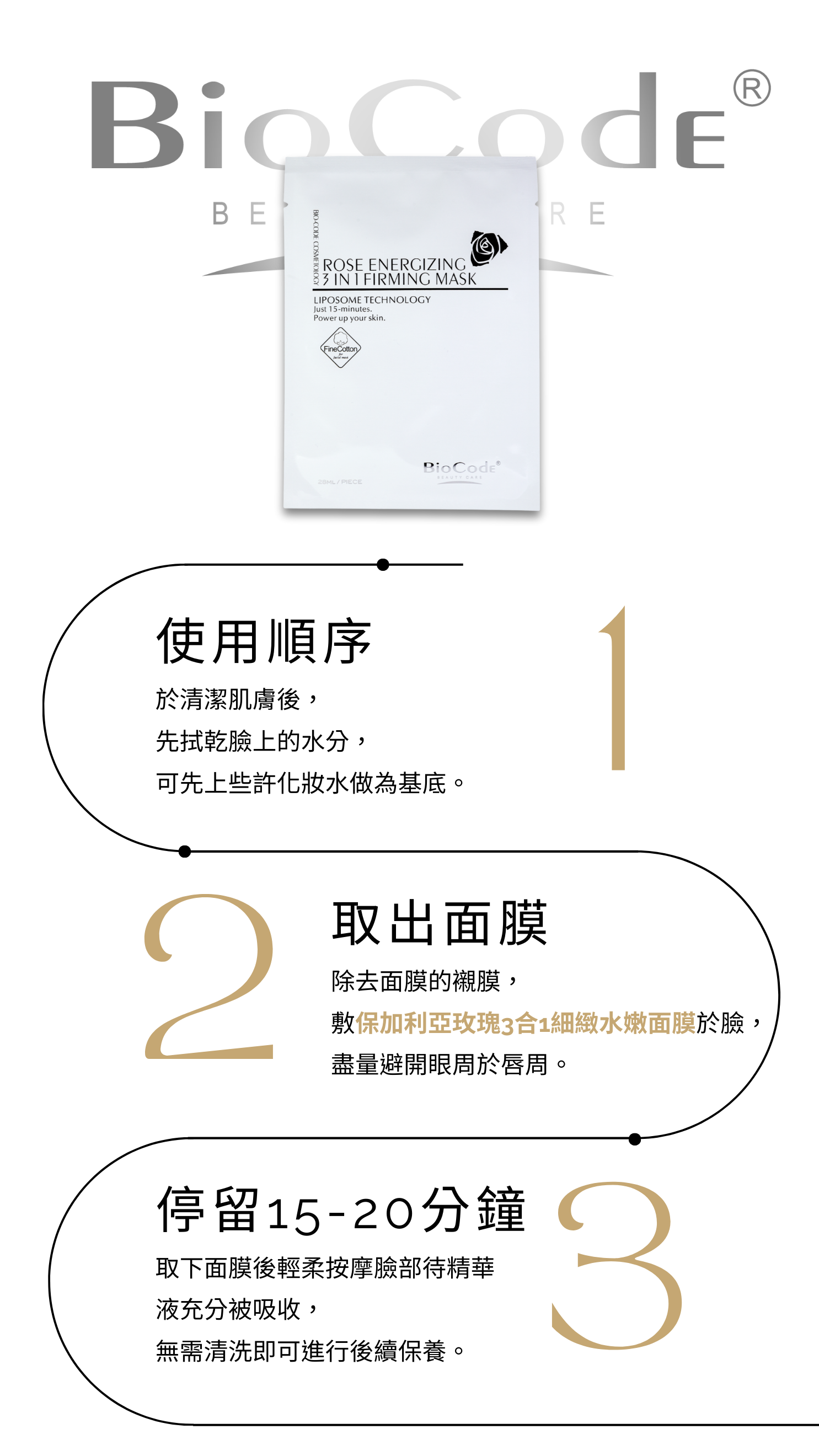 強化玫瑰精萃精華,注入於專利天然棉布膜中,高效完美包覆臉部線條。